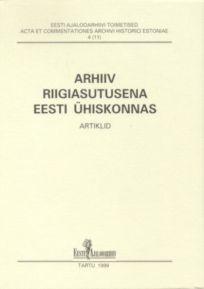 Sisukord Priit Pirsko. Riigiasutusena Eesti ühiskonnas Indrek Kuuben. Arhivaal, dokument, sari, säilik, toimik -- kas Gordioni sõlm? Kaja Pullonen. Asutuse ja arhiivi vahel Kurmo Konsa, Ruth Tiidor. Säilitamine arhiivis -- mis see on? Ene Hiio. Vallaomavalitsused ja vallaarhiivid läbi aegade Lea Leppik. Balti kindralkuberneri arhiivi lugu Endel Kuusik. Ajalooarhiivi ajaloost aastail 1939-1944 Birgit Kibal. 1935. aasta arhiiviseadus eel- ja järellugudega Martin Klesment. Institutsiooniajalooline andmebaas. Ametid ja ametnikud aadressraamatule rajanevas infosüsteemis