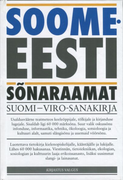https://raamatukoi.ee/soome-eesti-sõnaraamat-suomi-viro-sanakirja190230Soome-eesti sõnaraamat. Suomi-viro sanakirjahttps://raamatukoi.ee/media/catalog/product/s/o/soome-eesti-sonaraamat-suomi-viro-sanakirja.jpg00EUROutOfStock/Kõik teemad/sõnastikud ja keeleõpe11312125Kõigile soome keele huvilistele mõeldud põhjalikult uuendatud süsteemiga sõnaraamat sisaldab ca 60 000 märksõna, hulgaliselt sõnade kasutusnäiteid ja väljendeid. Sõnaraamatus on rohkesti uusi sõnu, sh võõrsõnu, slängisõnu, mitme valdkonna (nt infondus, sotsioloogia, ökoloogia, majandus, juriidika jne) terminoloogiat. Lisaks soome asesõnade käänamise ja verbi pööramise näidised. Astmevahelduse ja muuttüüpide tabelid. Rikkalik valimik soome lühendeid ja kohanimesid. Kõigile soome keele huvilistele mõeldud põhjalikult uuendatud süsteemiga sõnaraamat sisaldab ca 60 000 märksõna, hulgaliselt sõnade kasutusnäiteid ja väljendeid. Sõnaraamatus on rohkesti uusi sõnu, sh võõrsõnu, slängisõnu, mitme valdkonna (nt infondus, sotsioloogia, ökoloogia, majandus, juriidika jne) terminoloogiat. Lisaks soome asesõnade käänamise ja verbi pööramise näidised. Astmevahelduse ja muuttüüpide tabelid. Rikkalik valimik soome lühendeid ja kohanimesid.